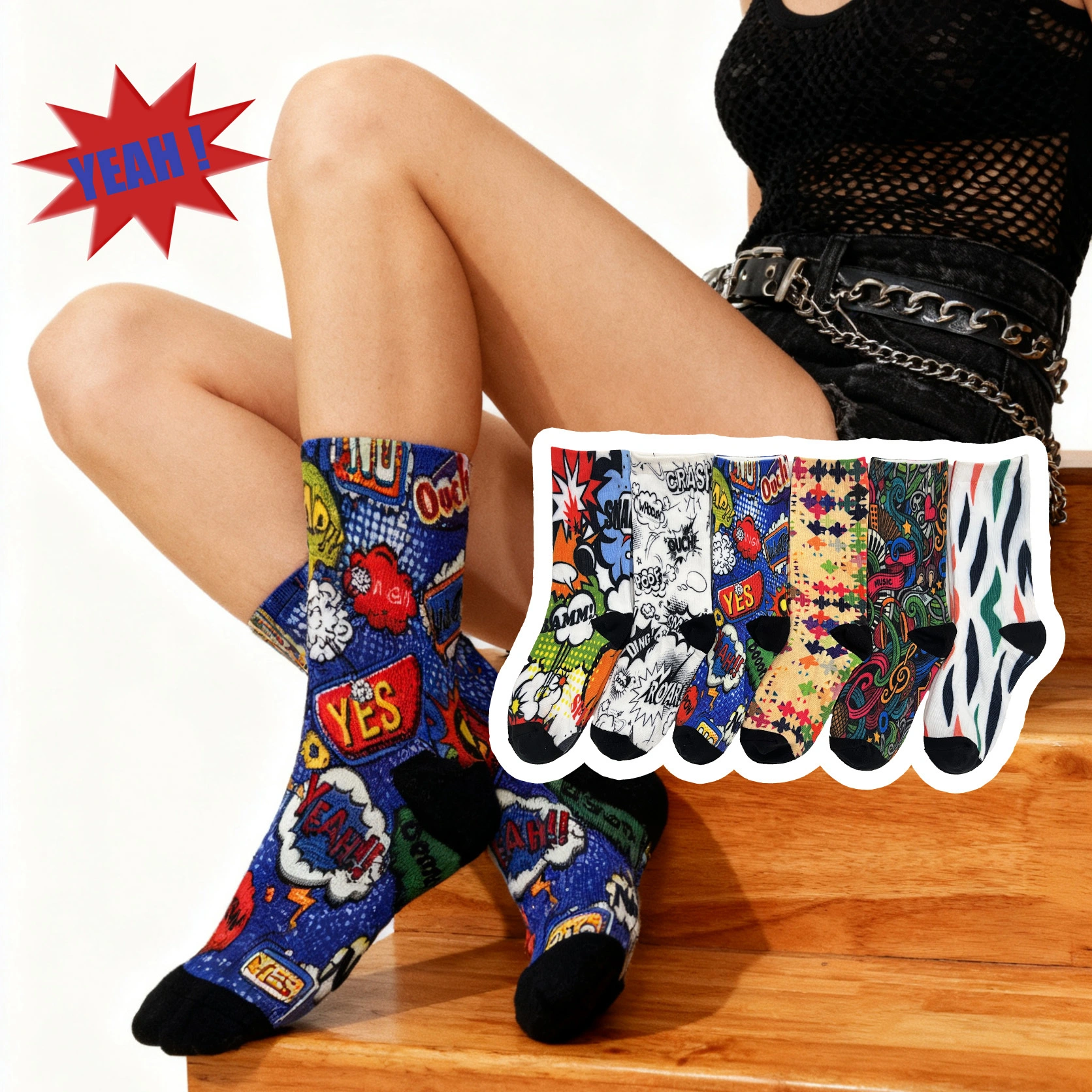Our Custom Wholesale Women 360 Print Socks (HY-W-089) are designed to merge fashion and individuality. With full 360-degree printing, each pair showcases eye-catching, intricate designs that cater to diverse tastes—from retro comic vibes to abstract art and colorful motifs.